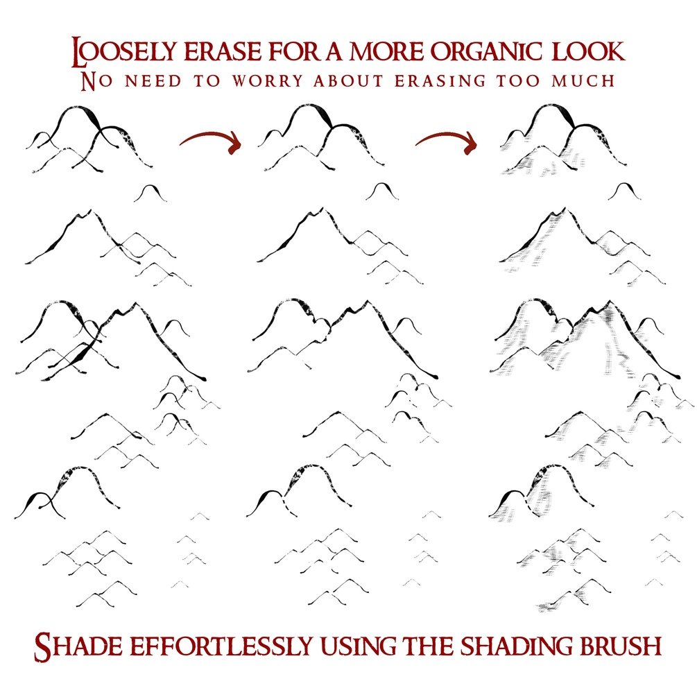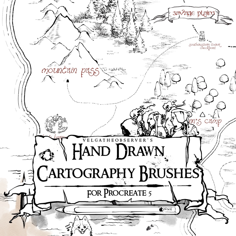 These brushes use flip dynamics and are grained, so that every stroke you make will look unique. I've tried cartography brushes other people made but they just don't do it for me....plenty of things wrong with them but anyway thanks to those I've been able to make sure mine are definitely HD even if you go 4k @300DPI, look organic, and intuitive enough that people can make a legit map by straight up drawing with them. No fancy pants Photoshop features, just the good ol' drawing experience with Procreate. Pick a brush, and boom! draw away~ :P